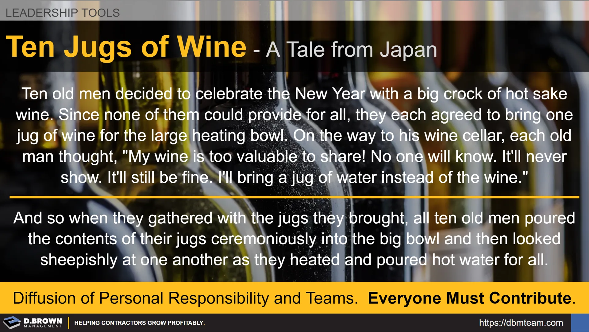 Ten old men decided to celebrate the New Year with a big crock of hot sake wine. Since none of them could provide for all, they each agreed to bring one jug of wine for the large heating bowl. On the way to his wine cellar, each old man thought, "My wine is too valuable to share! No one will know. It'll never show. It'll still be fine. I'll bring a jug of water instead of the wine."