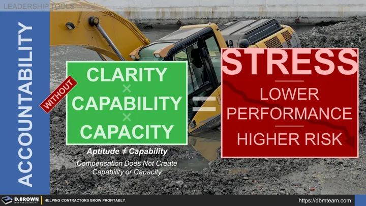 Without clarity, capability, and capacity, the accountability will lead to higher levels of stress which will decrease performance and lead to higher levels of risk. There is the physical risk that shows up on a jobsite when crews are working sustained overtime, leaving them more prone to errors and accidents. In the office there is similar risk when it comes to customer satisfaction, financial performance, and the development of people.