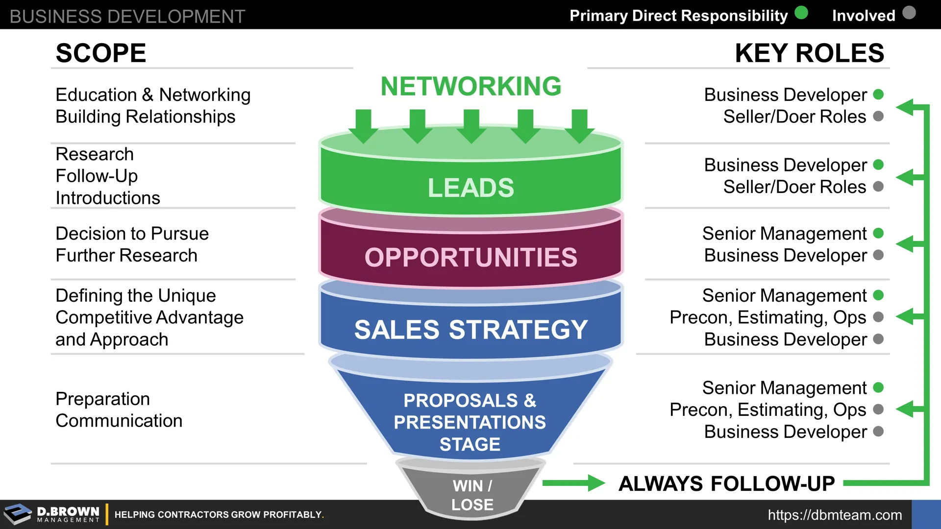 Looking at the whole value stream from prospecting through project close-out you can see the key roles involved at different stages. It's important that the person in the lead at each stage has the right capabilities and is absolutely the right fit for the customer.