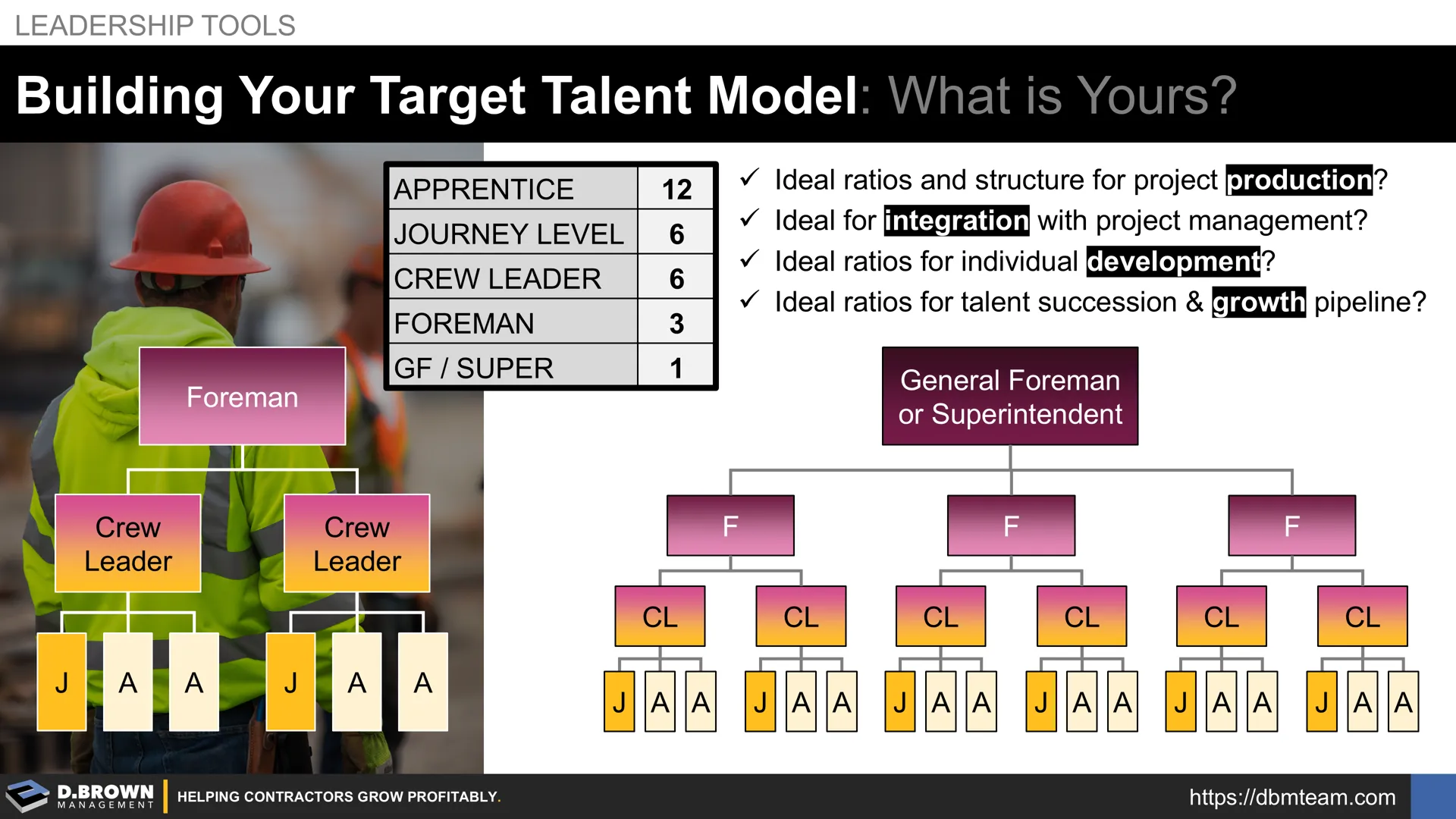 - The structure and ratios around a related set of job roles. For example, what does the field workforce look like from Superintendent through Apprentice?