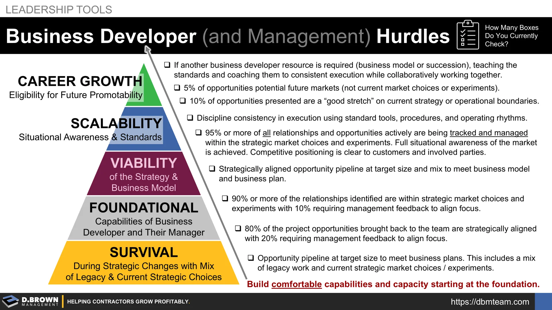 Your objective is building comfortable capabilities and capacity for business development starting at the foundation. Some may get checked off out of order but in general, you will progress through these nine hurdles.