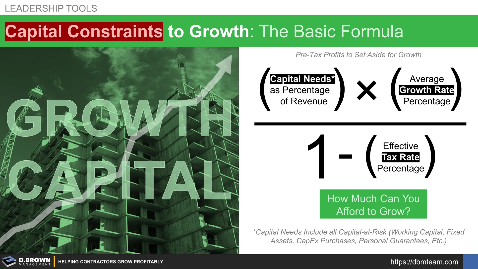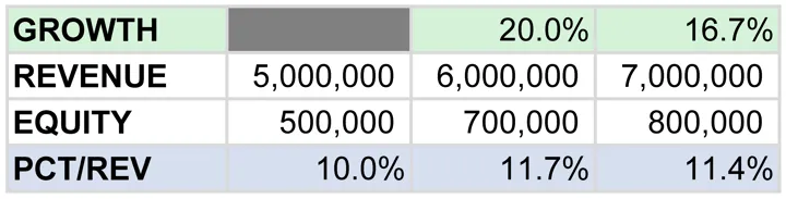 Example: A contractor has capital needs of 10% and plans on growing an average of 15% to meet their strategy and three-year business plan. They are structured as an S-Corp and their combined state and federal tax rate is effectively 40%. They must retain 2.5% of their Revenue each year to fund that growth. 10% x 15% = 1.5% / 60% = 2.5%.
