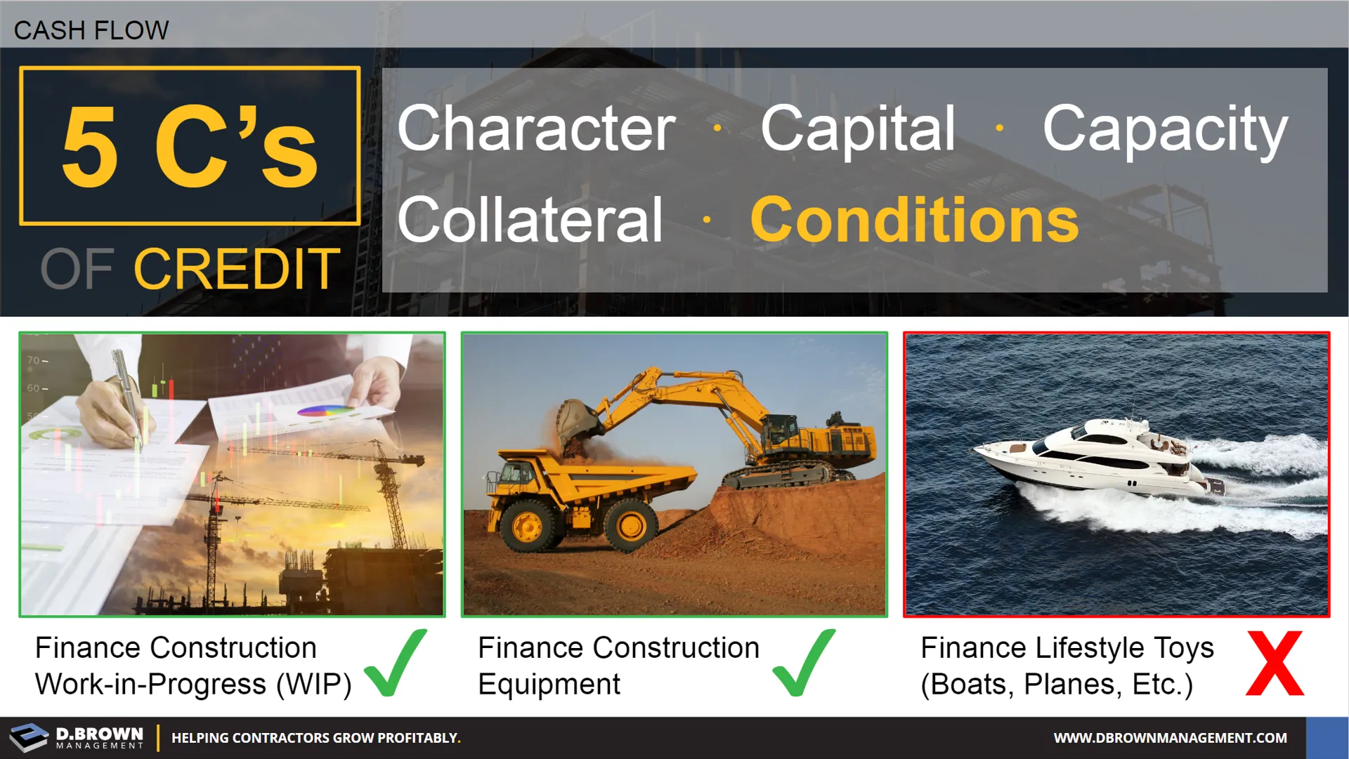 The 5th of the 5Cs of Credit are the conditions for the loan, which is primarily what the funds will be used for. These conditions are here to protect the contractor as much as they are there to protect the bank.