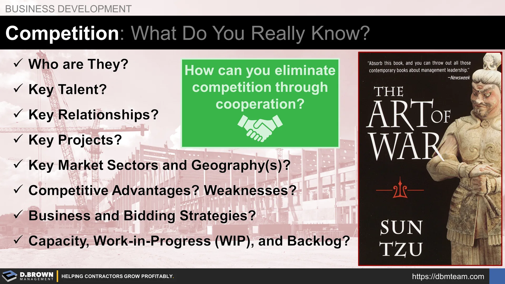 Respect "Good Competition" as any more than a 25-30% market share should be the target for any contractor to maintain margins and minimize risk.