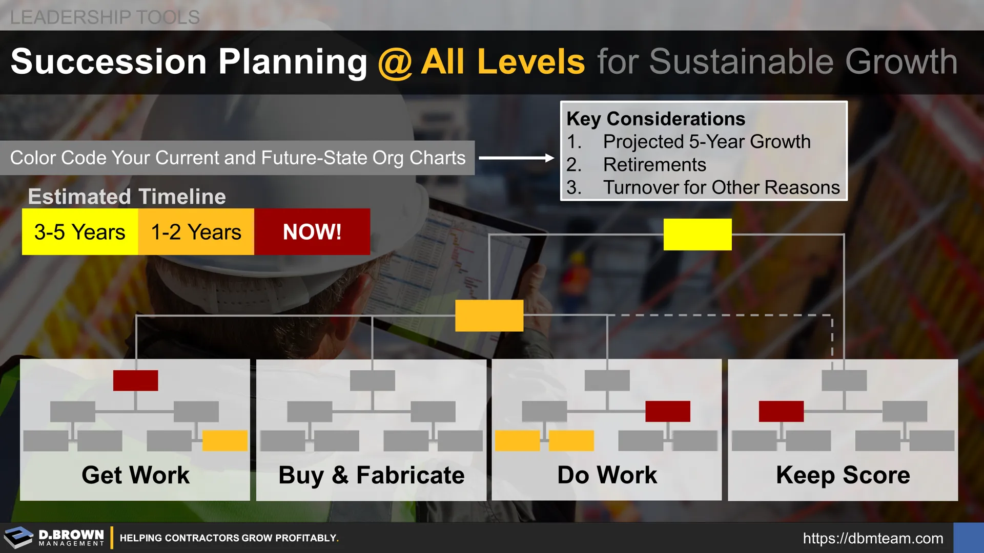If a construction company is growing at 15% per year, it will double in size about every five years. Therefore, in general, every position must have identified and be training at least two people that will be capable of succeeding them within five years. Read more...