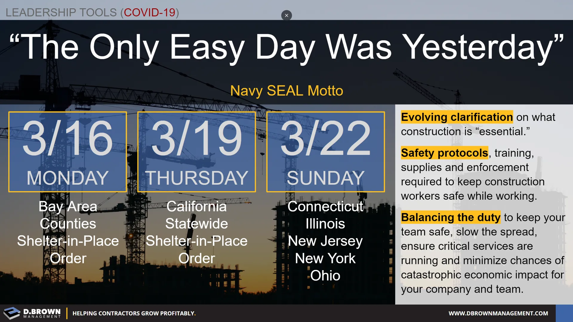 Prepare yourself and your team for 8-12 weeks that will look just like last week looked for every construction executive and field leader in California. Prepare for many more difficult conversations with your team, your suppliers, and your customers. Be the calm in the storm.
