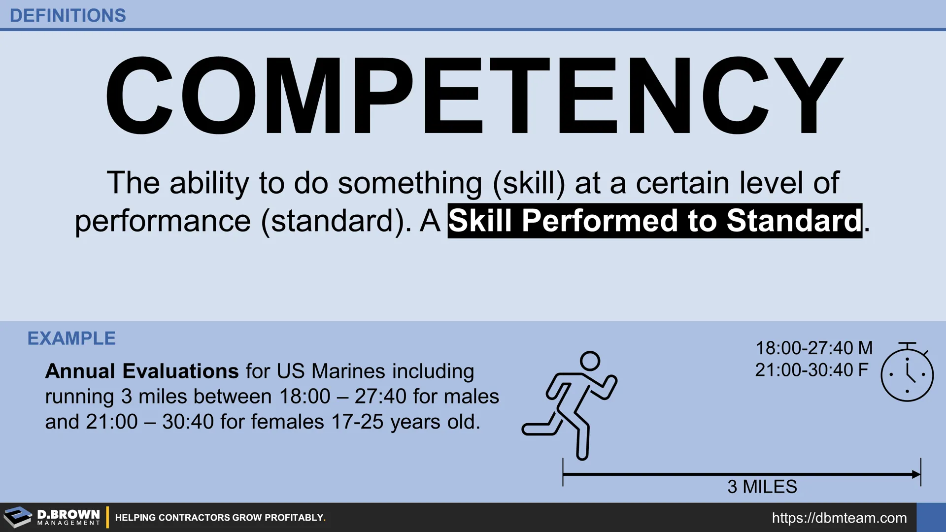 The ability to do something (skill) at a certain level of performance (standard). A Skill Performed to Standard.
