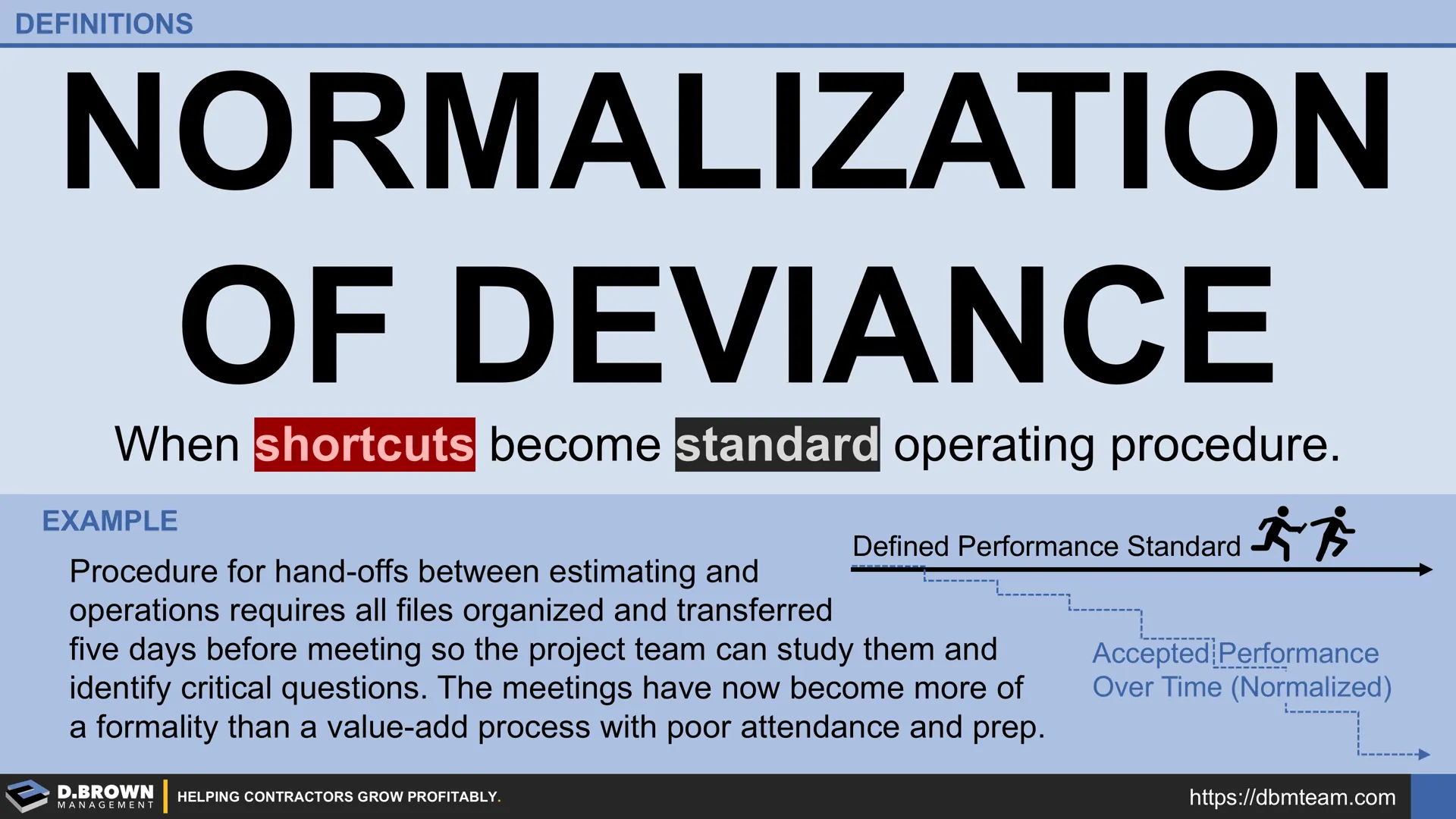 A common example of “normalization of deviance” starts with the hand-off meeting that nearly every contractor has between award of the construction scope and turnover to the project teams who will build the project. It may be called different things by different contractors, but the general flow is similar. The ideal hand-off looks like a great baton pass in an Olympic relay.