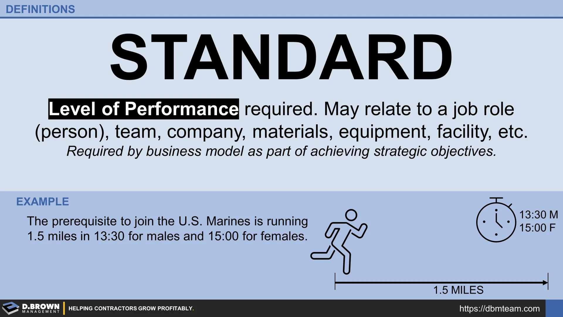Level of Performance required. May relate to a job role (person), team, company, materials, equipment, facility, etc. Required by business model as part of achieving strategic objectives.