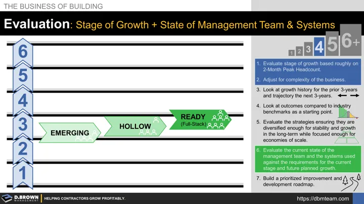 - Evaluate the current state of the management team and the systems used against the requirements for the current stage and future planned growth.