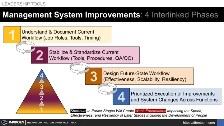 Management systems are the glue that connects a contactor's strategies, plans, projects, people, and resources together to make progress toward its vision. The right management systems create predictable outcomes based on the business model. As a note, we target 2-3X industry benchmarks for most outcome metrics, and this is achievable through a balanced approach. Management systems are the foundation for growth and must evolve as conditions change. That evolution is best managed in four distinct but interlinked phases: