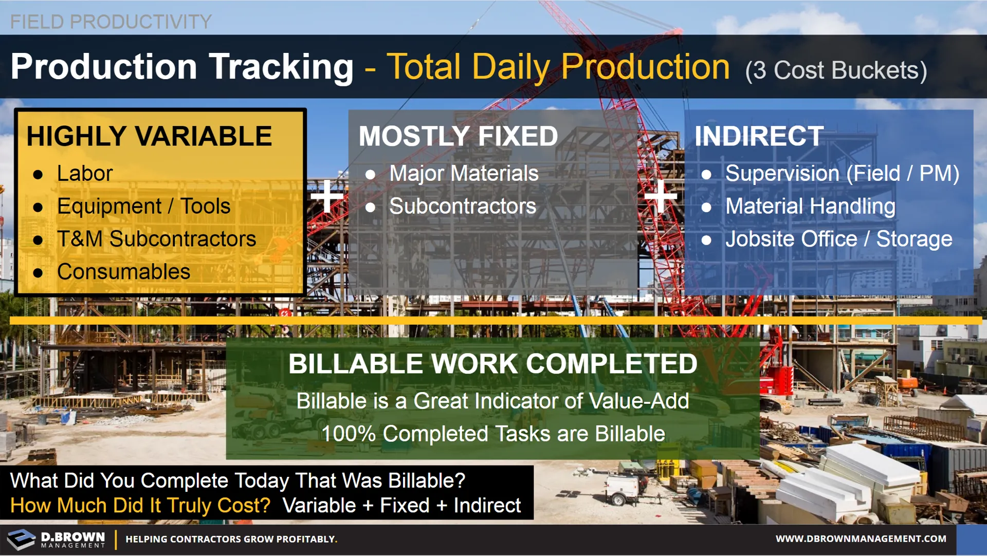 Optimizing productivity is about keeping the ratio of actual costs vs. billable equal to or lower than the ratio of your budget vs. contract. Watch this as a daily, weekly, monthly and a running Job-to-Date (JTD) metric.