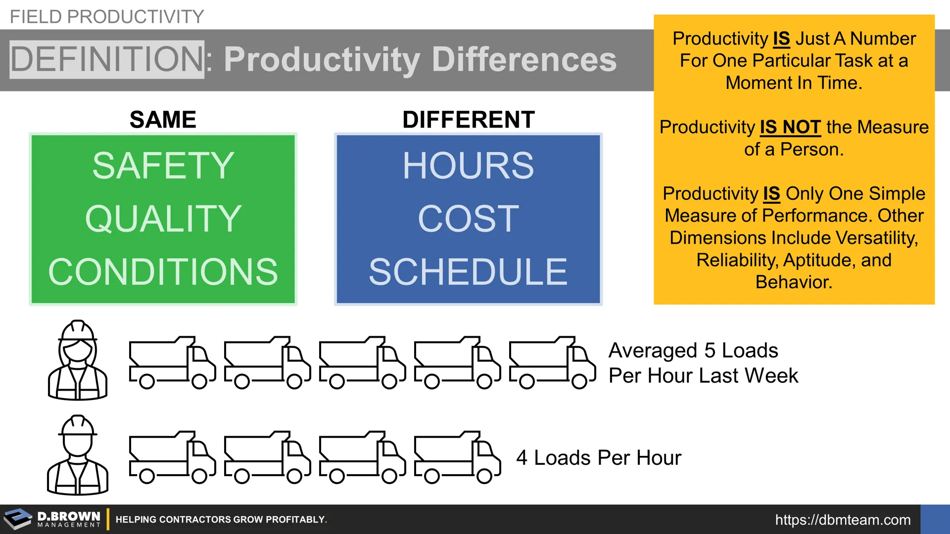 Productivity differences at the individual or equipment level mean that you have differences in hours, cost, or schedule given the same safety, quality, and conditions.