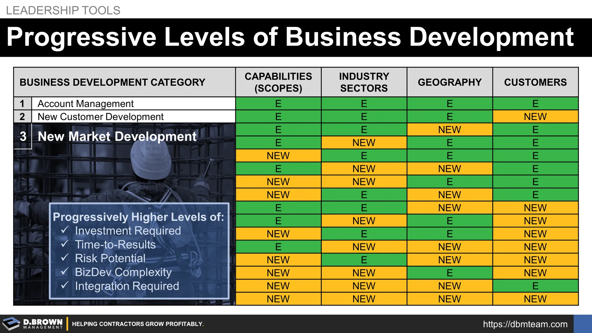 As a contractor navigates the stages of growth and makes different strategic choices about industry sectors, scopes of work (capabilities), geography, and customers, the business development processes and people must also evolve. This includes both major market choices and strategic experiments.