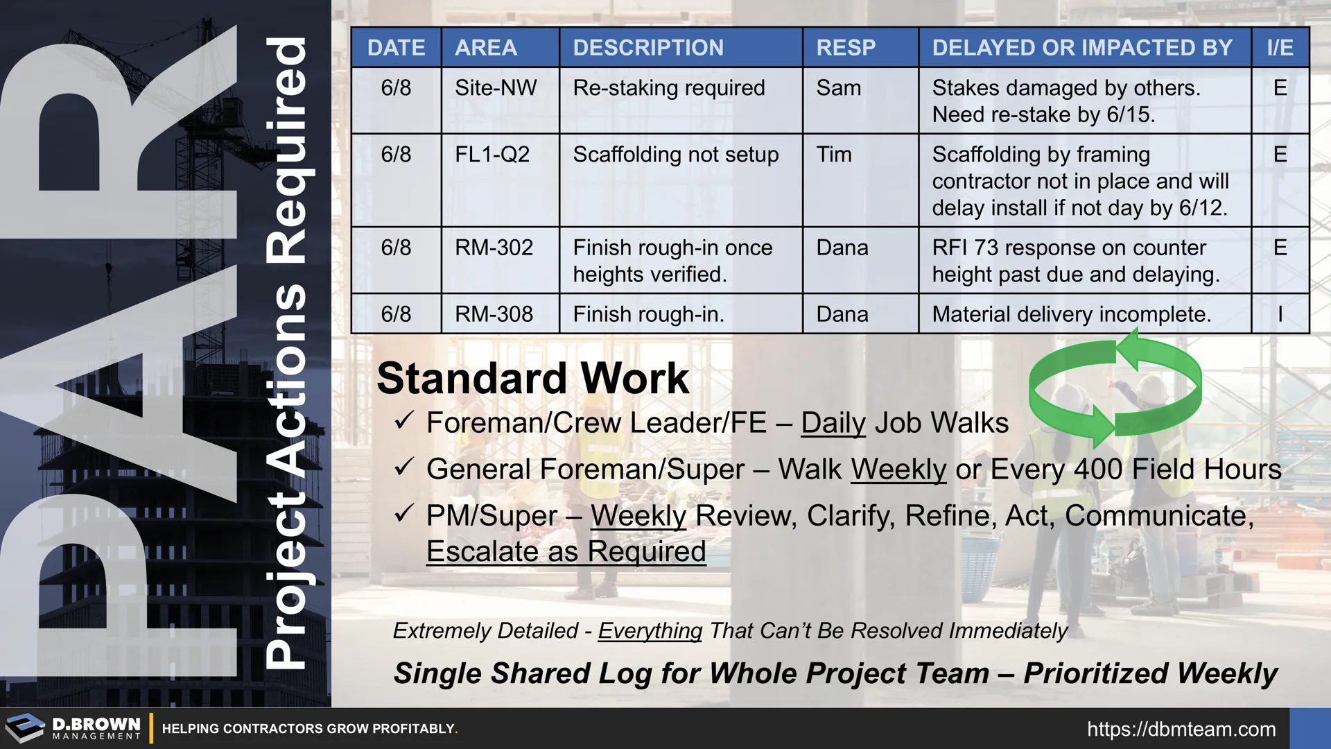 - When the managers who directly oversee PMs and Foremen aren’t disciplined about executing the system, it breaks down. If the leader isn’t engaged, the process won’t work. This approach requires effective delegation — including clear standards and a QA/QC process. It’s not just an idea to float out to the project teams.