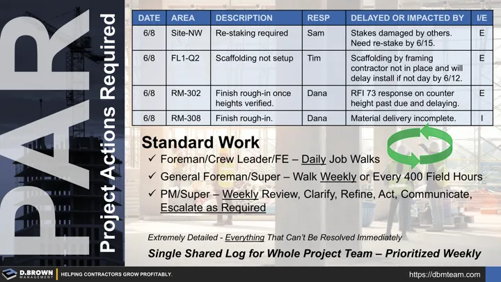 - Reviewing the schedule, plans, specs, construction documents, and walking the job together to develop Project Actions Required (PAR) is a great tool for evaluating and developing new Crew Leaders, Foremen, Field Engineers, Project Engineers, and Project Managers. It makes Situational Awareness, problem solving, and prioritizing as visible as physical performance in a game.