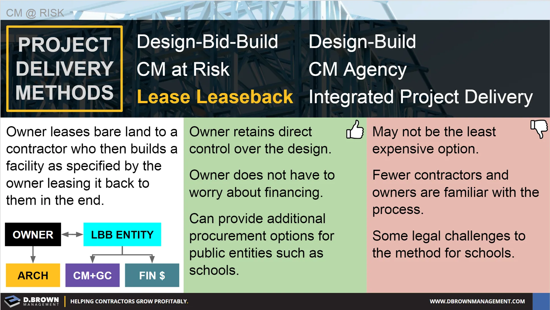 This method allows the Project “Owner” the opportunity to get a facility that suits their very specific needs with no capital outlay up front. Sometimes, the land is owned by the customer and the bare land is leased to the contractor for $1 and then the completed building is leased back to the customer.