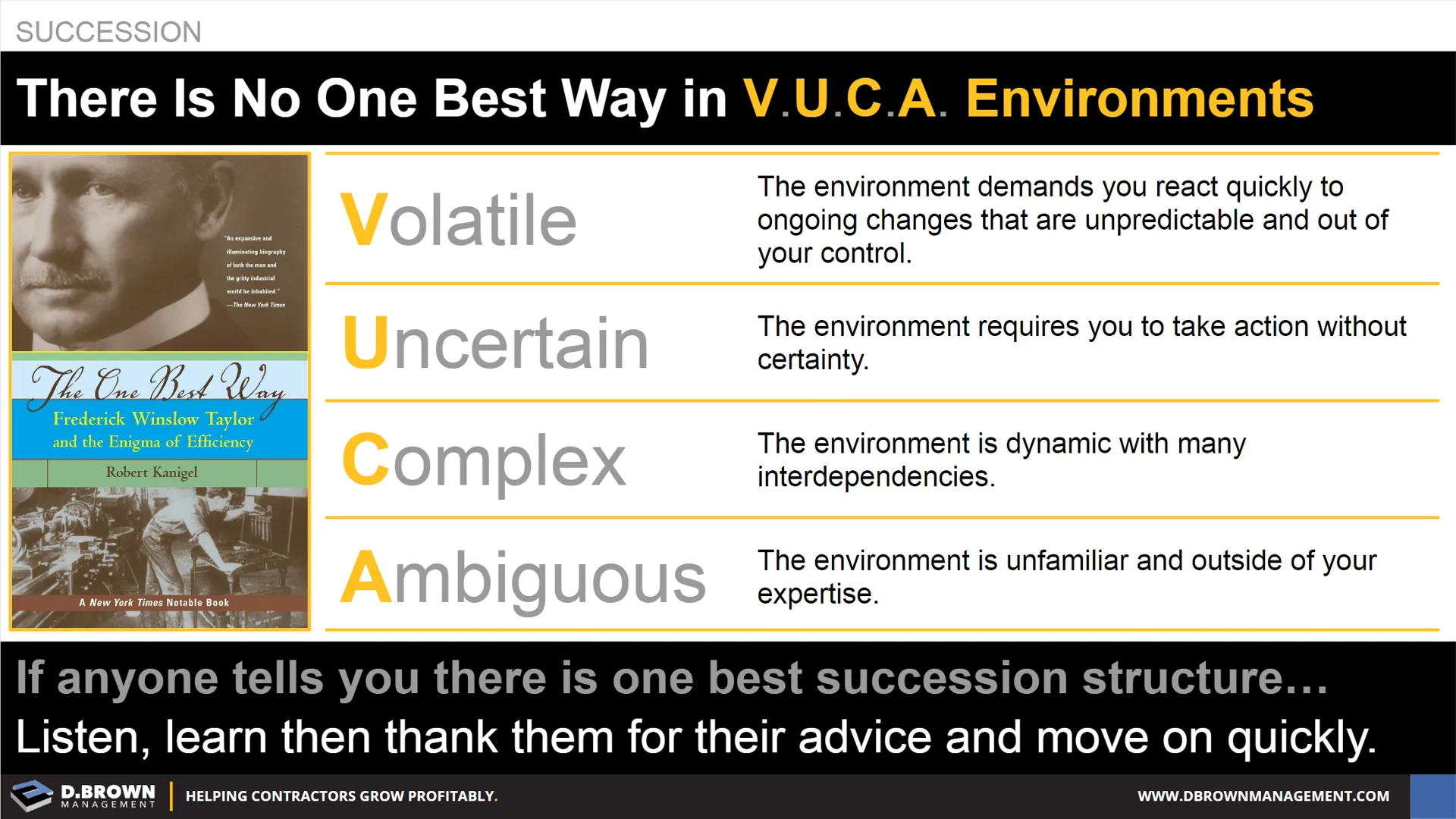 However, as systems become more complex (or V.U.C.A.), such as operating a company or succession planning, there is not a single “One Best Way” that will work in all situations.