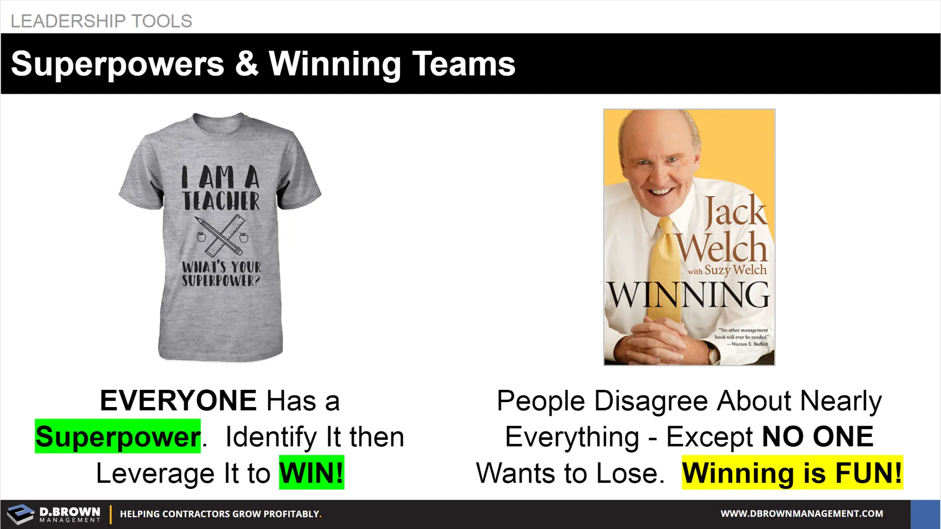 - Superpowers: EVERYONE has a few things that they do where they are in the top 5%. Get everyone to identify the Top 3 Superpowers for themselves and each other. Discuss and prioritized for each team member constantly reminding everyone that the importance is getting the right people in the right positions. Never have the left-tackle play as quarterback and vice versa.