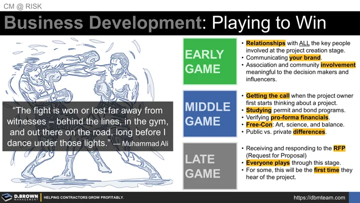 As contractors navigate different stages of growth, they will be getting involved in the game progressively earlier. A contractor in stages 1-3 of growth is likely competing mostly in the late game and their focus has to be on operational excellence (OpEx). Looking all the way toward the other end of the growth spectrum would be Bechtel's business development philosophy: