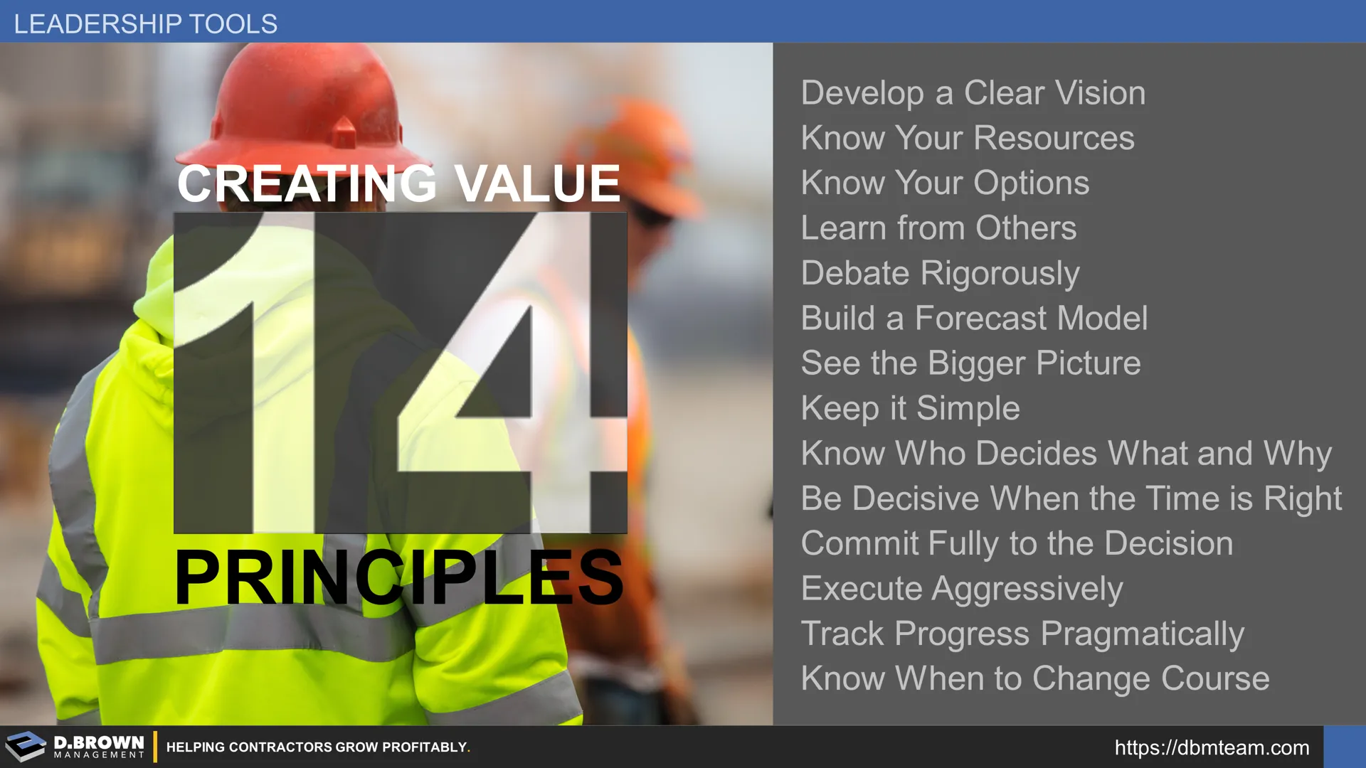 These principles for creating value in the construction industry are our foundation. They support Our Mission and Our Promises. They are further expanded into more detailed principles supporting every major area of a construction business, including "Basic Principles & the Math of Growth" and "Field Productivity Principles."