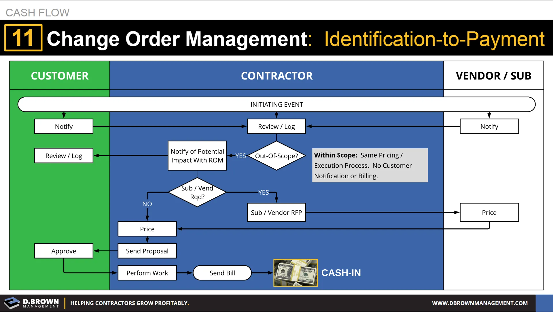 A well managed change order process will have a hugely positive impact on customer satisfaction, profitability, and cash flow. A poorly managed process will negatively impact all three and will sometimes impact cash for years if it goes into a claim situation.