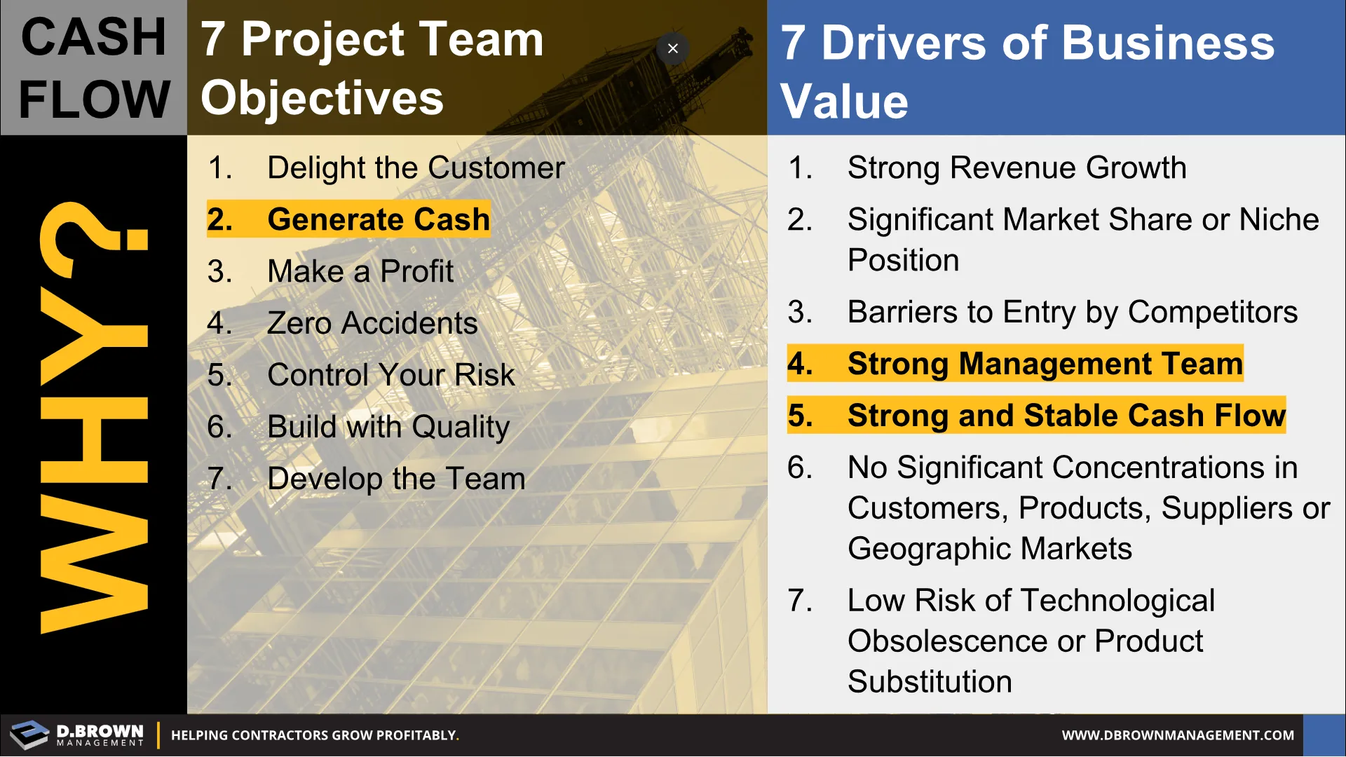When you align your executive, finance, and project teams around improving your cash flow scoreboard, you will develop business management skills throughout the organization.