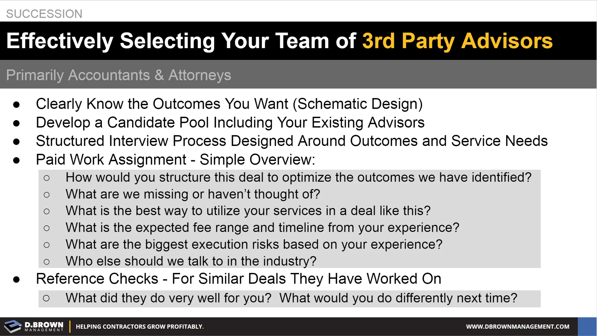 - Your existing attorney, CPA, and consulting relationships may or may not be the best choice for helping you through the succession process. Run them through the same rigorous selection process as other candidates for your advisory team.