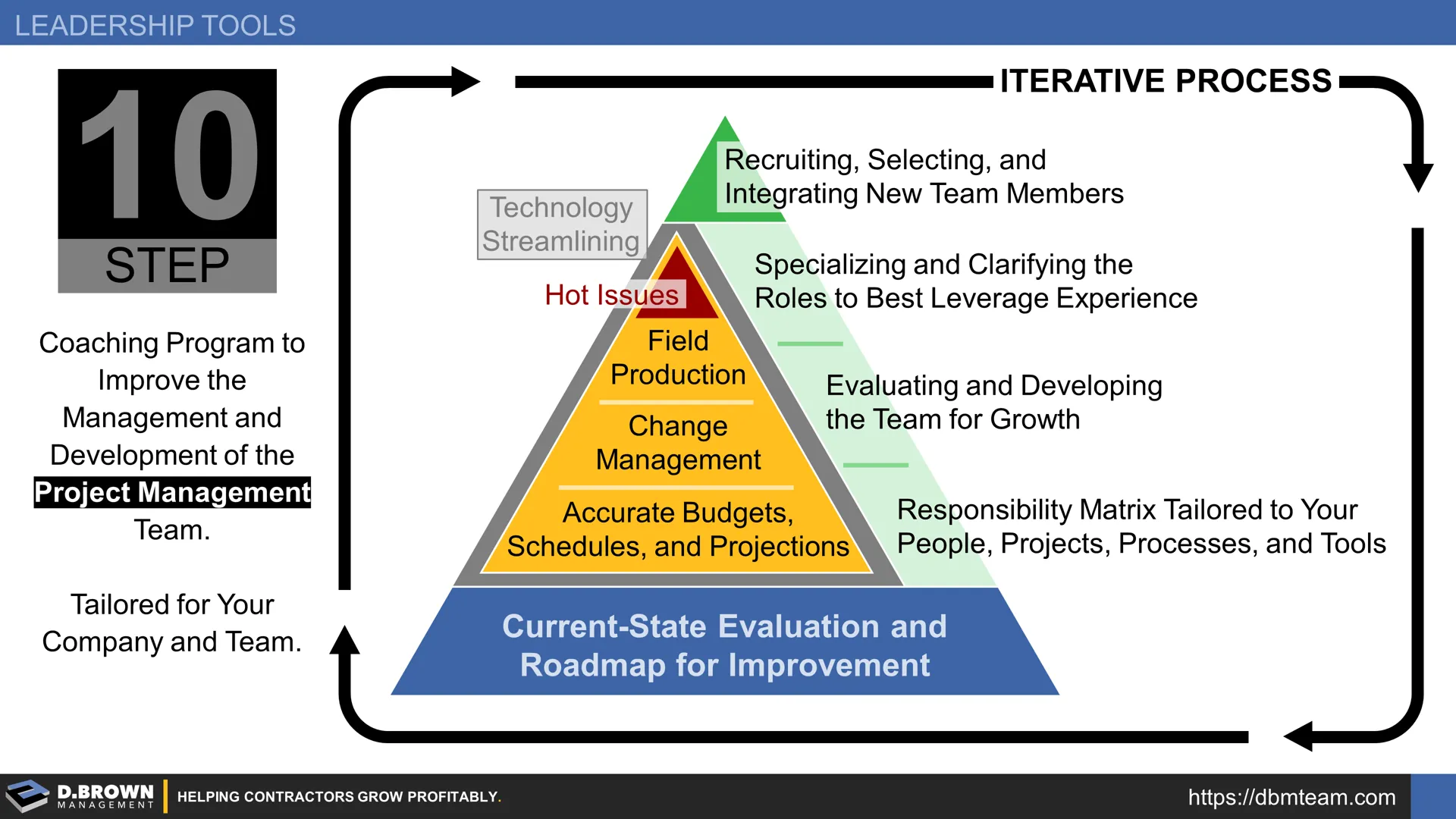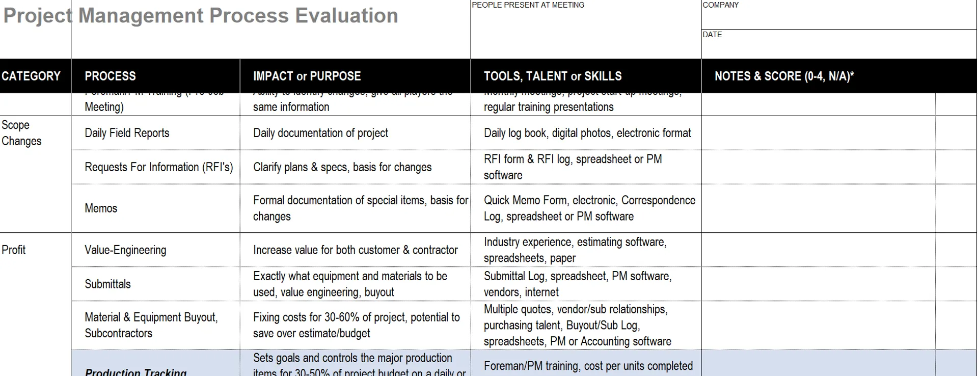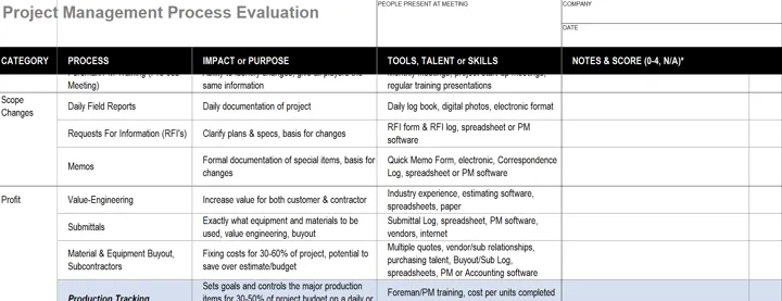 Evaluation: Our starting point is a current-state evaluation looking at everything the Project Management team is involved in. When PMs are first involved varies widely between contractors and at different stages of growth. This is an ongoing dialog to understand the process, how consistently it is being executed, and how well it aligns with your current stage of growth and future plans. Outcomes include: